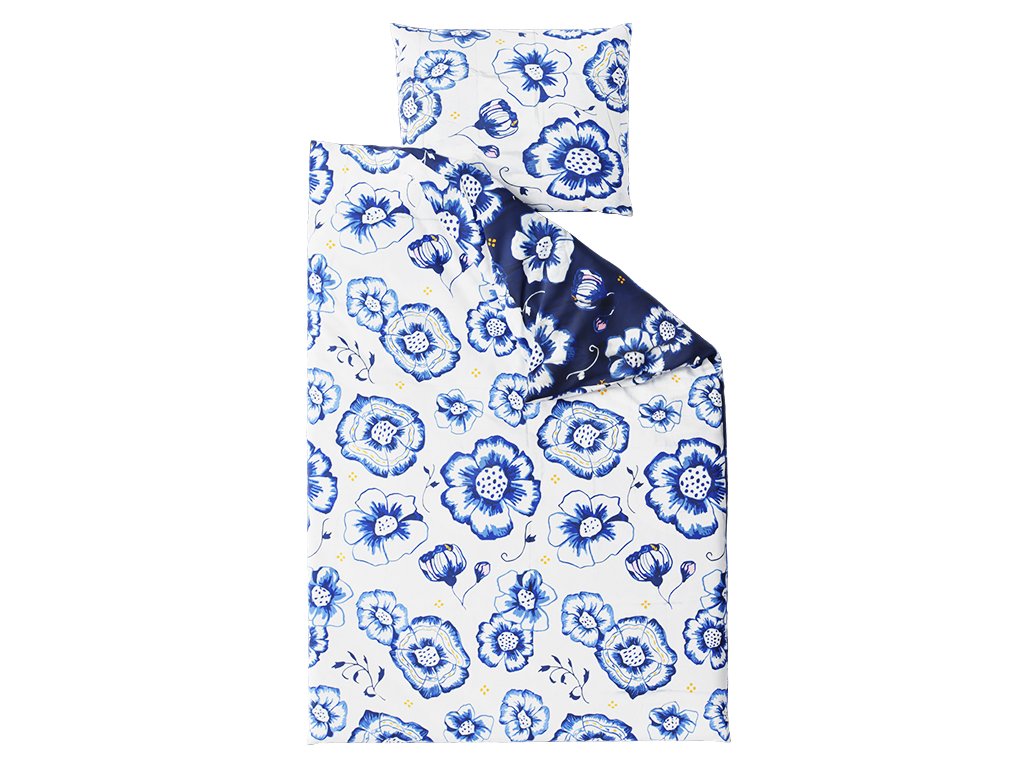 Súprava je obojstranná – jedna strana má tmavomodré pozadie s bielymi kvetmi, druhá naopak biele pozadie s modrými motívmi.