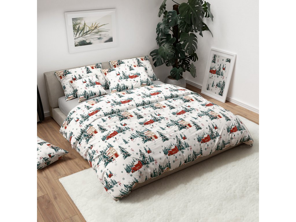 Bavlnené obliečky SNOWY HOUSES v bielej farbe prinášajú do vašej spálne pravú zimnú atmosféru. Vďaka zasneženým domčekom a stromom vynikajú svojou sviatočnou náladou, ktorá sa skvele hodí nielen na Vianoce.
