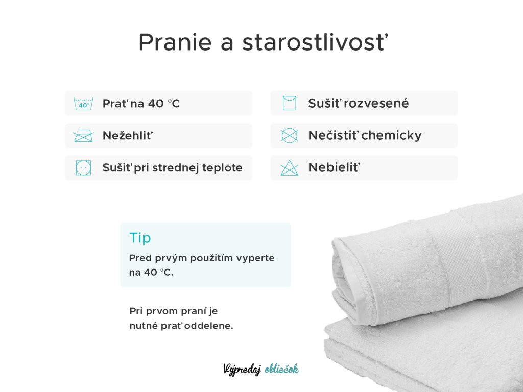 Túžite po stále jemných a mäkkých osuškách?! Najdôležitejšie je správna starostlivosť. Osušky odporúčame pred prvým použitím vyprať pri teplote 40 °C, potom usušiť zavesené alebo v bubnovej sušičke na normálnej, skôr nižšej teplote. Osušky sa nemôžu čistiť chemicky, ani bieliť. Žehlenie sa neodporúča z možného poškodenia slučiek, materiál by stratil savosť a svoju jemnosť.