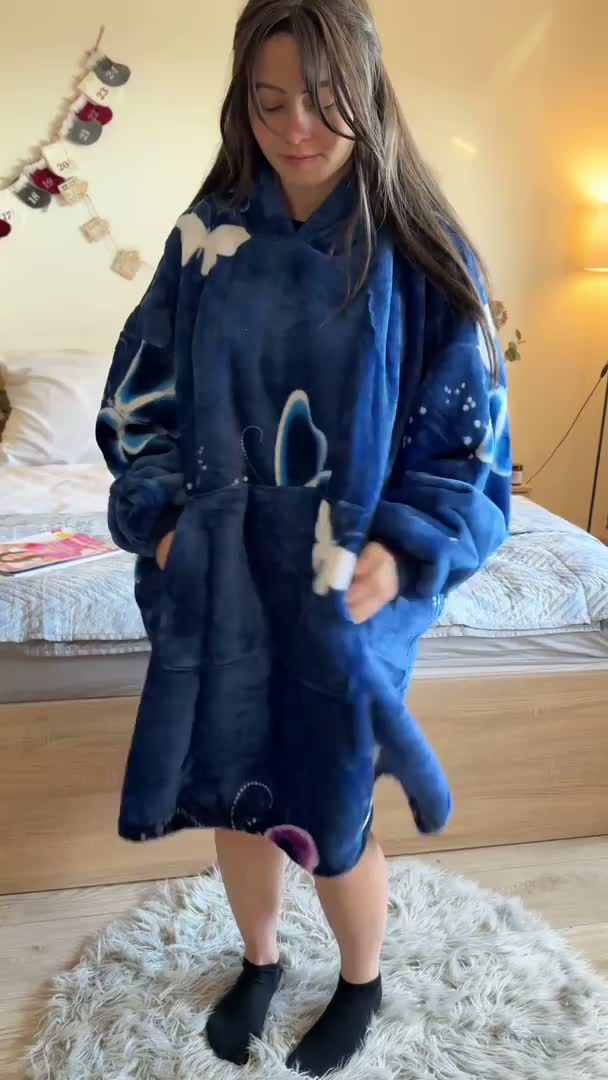 Baránková mikinová deka s rukávmi a kapucňou VIOLET BUTTERFLY, tmavomodrá