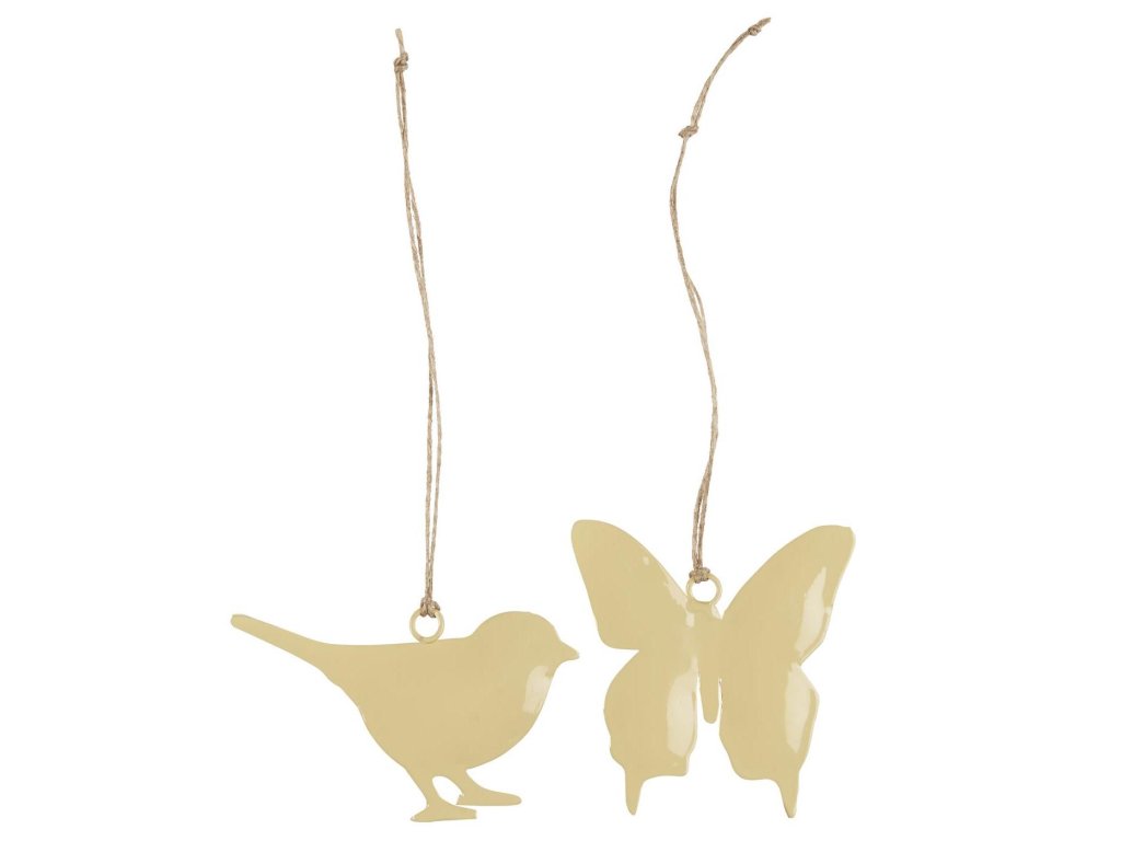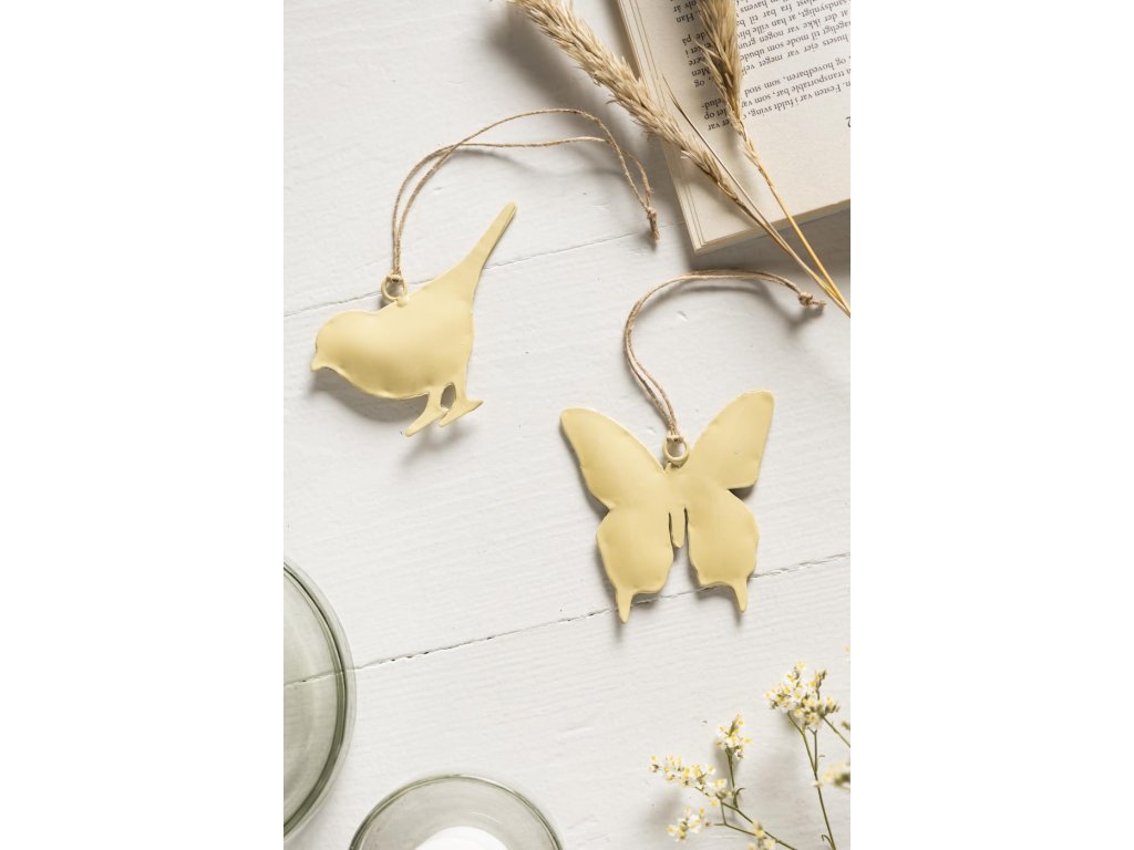 Závesný kovový vtáčik a motýlik na jutovom povrázku WHEAT STRAW