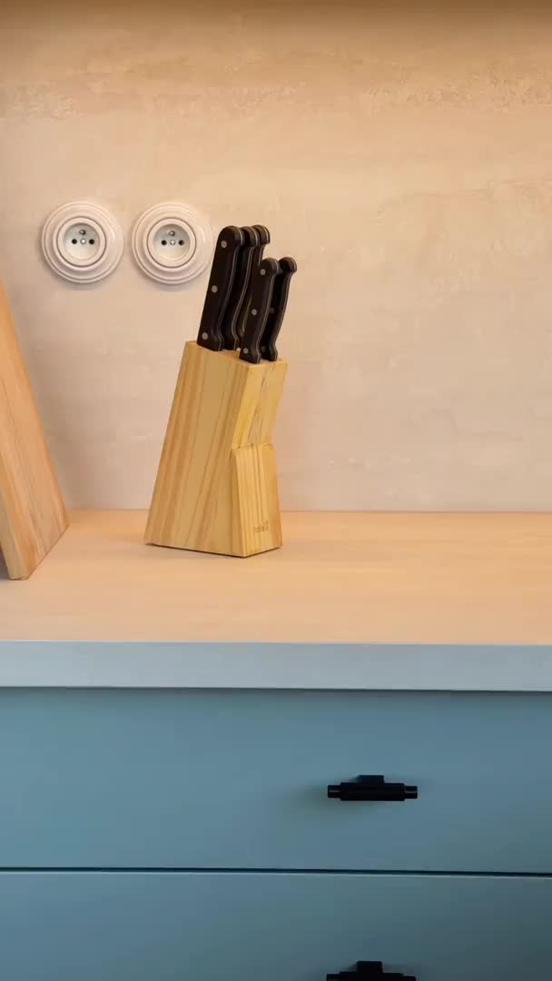 - Drevený blok na nože – zaisťuje bezpečné skladovanie a rýchly prístup