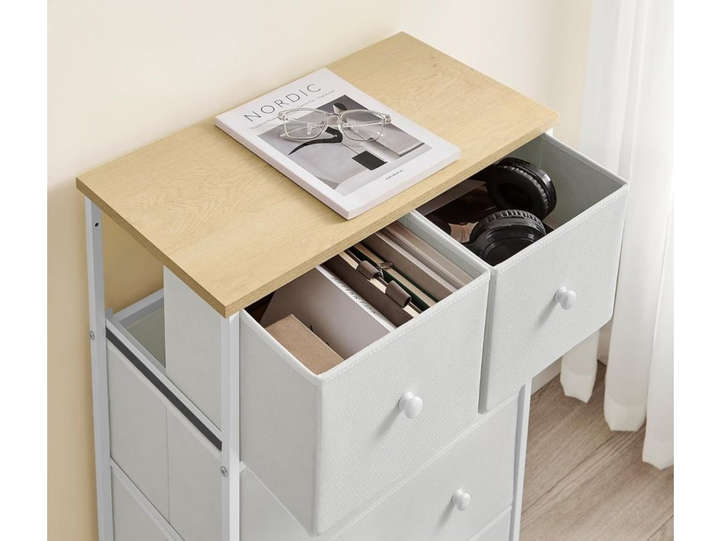 Komoda s textilnými zásuvkami je ideálnym riešením pre všetkých, ktorí hľadajú kombináciu funkčnosti a estetiky. Je ľahká, jednoducho premiestniteľná a zároveň prekvapivo priestranná – skvele sa hodí do menších bytov aj väčších interiérov. Či už potrebujete uložiť oblečenie, doplnky, dokumenty alebo drobnosti každodennej potreby, komoda vám pomôže udržať všetko prehľadne a štýlovo usporiadané. Vďaka svojmu univerzálnemu vzhľadu sa ľahko zladí s ostatným nábytkom a stane sa praktickým a elegantným pomocníkom v každej domácnosti.