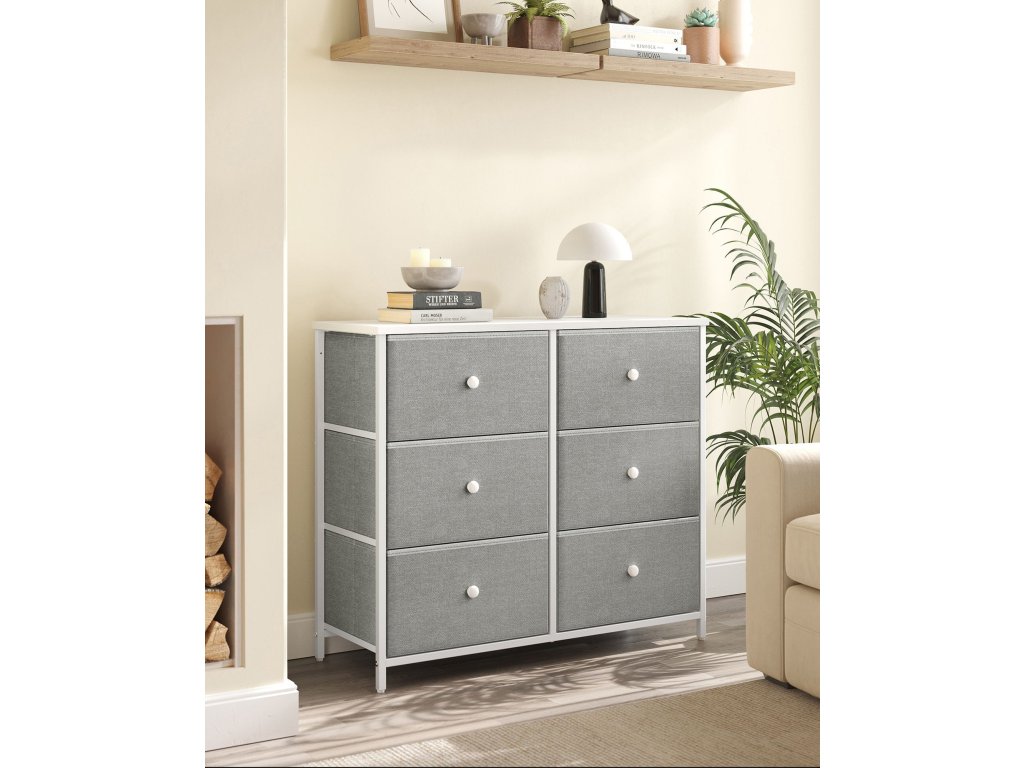 Táto štýlová komoda v kombinácii sivej textílie a bielej konštrukcie je ideálnym riešením pre každodennú organizáciu. Či už ju umiestnite do spálne na spodnú bielizeň, do predsiene na doplnky alebo do detskej izby na hračky, vždy ponúkne dostatok priestoru vďaka 6 priestranným zásuvkám. Vďaka svojej ľahkej konštrukcii sa ľahko presúva, a predsa zostáva stabilná vďaka výstuhám a možnosti prichytenia k stene. Elegantný vzhľad a praktické využitie z nej robia ideálnu voľbu pre každý domov.