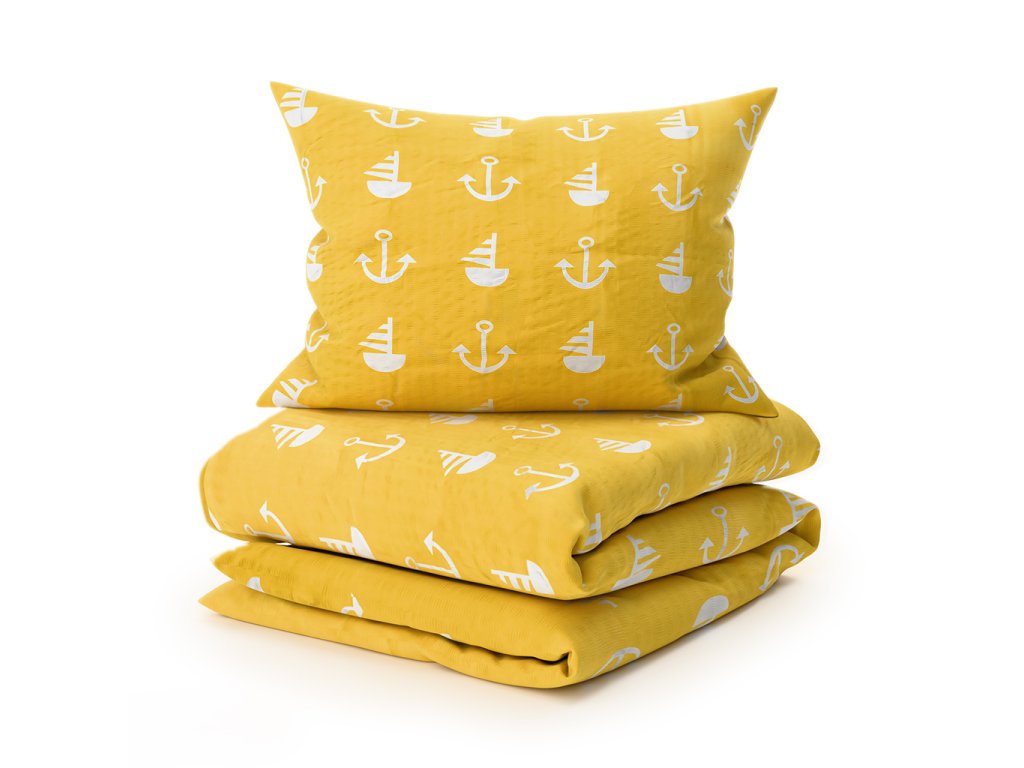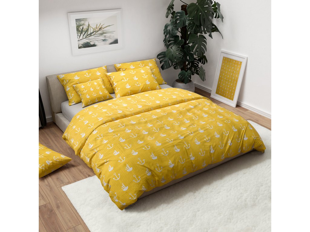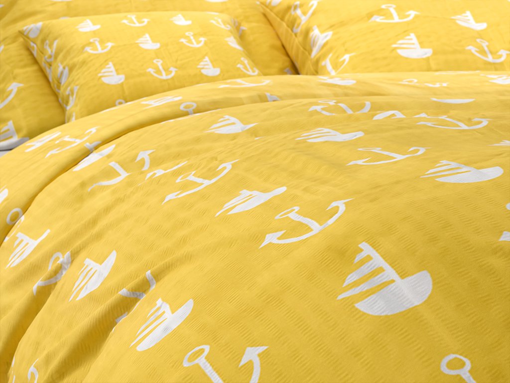 Objavte veselé a praktické krepové obliečky KOTVA v žltej farbe, ktoré rozžiaria každú spálňu. Dizajn s bielymi kotvami a loďkami prináša námornú atmosféru, ktorá vnesie do vášho interiéru ľahkosť a optimizmus.