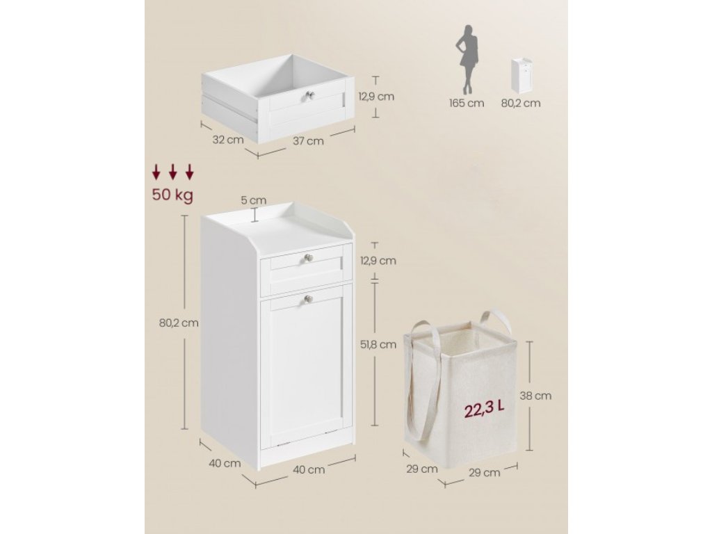 Táto skrinka prináša praktické riešenie pre udržanie poriadku vo vašej kúpeľni. Vďaka kombinácii úložného priestoru, zásuvky a koša na bielizeň ponúka miesto pre všetko, čo potrebujete – od kozmetiky až po špinavú bielizeň. Vyberateľný vak s vodoodpudivou úpravou uľahčuje manipuláciu s bielizňou, zatiaľ čo kvalitná MDF odolná voči vlhkosti zaisťuje dlhú životnosť aj vo vlhkom prostredí. Elegantný dizajn a kompaktné rozmery skrinky umožňujú ľahké začlenenie do akejkoľvek kúpeľne a zároveň zaisťujú, že všetko bude mať svoje miesto.