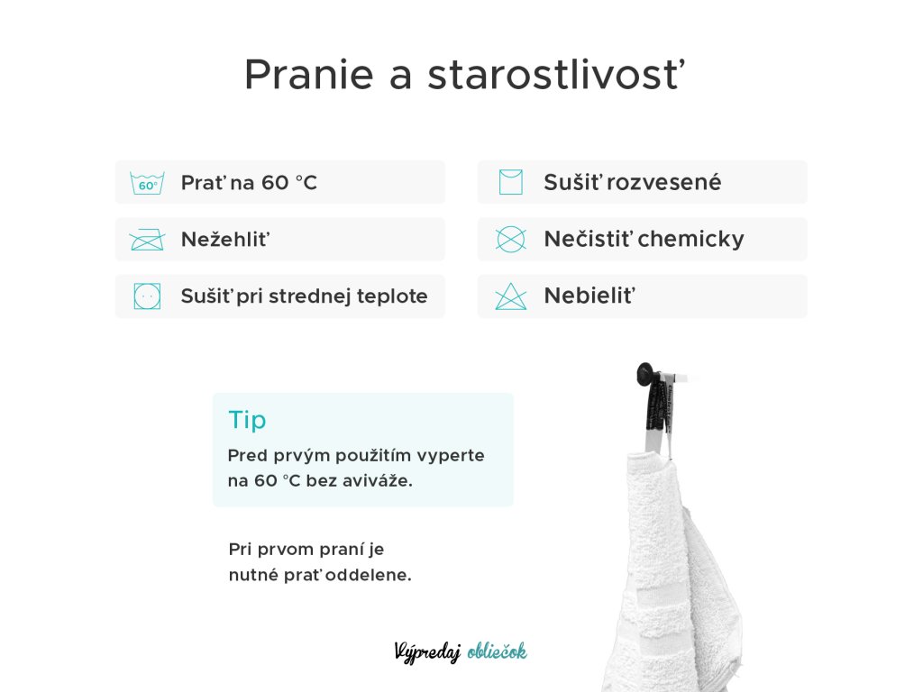 Chcete, aby vaše uteráky boli stále jemné a mäkké?! Dôležitá je správna starostlivosť o daný produkt. Uteráky odporúčame pred prvým použitím vyprať pri teplote 40 °C, potom usušiť zavesené alebo v bubnovej sušičke na normálnej, skôr nižšej teplote. Uteráky sa nemôžu čistiť chemicky, ani bieliť. Žehlenie sa neodporúča z možného poškodenia slučiek, materiál by stratil savosť a svoju jemnosť.