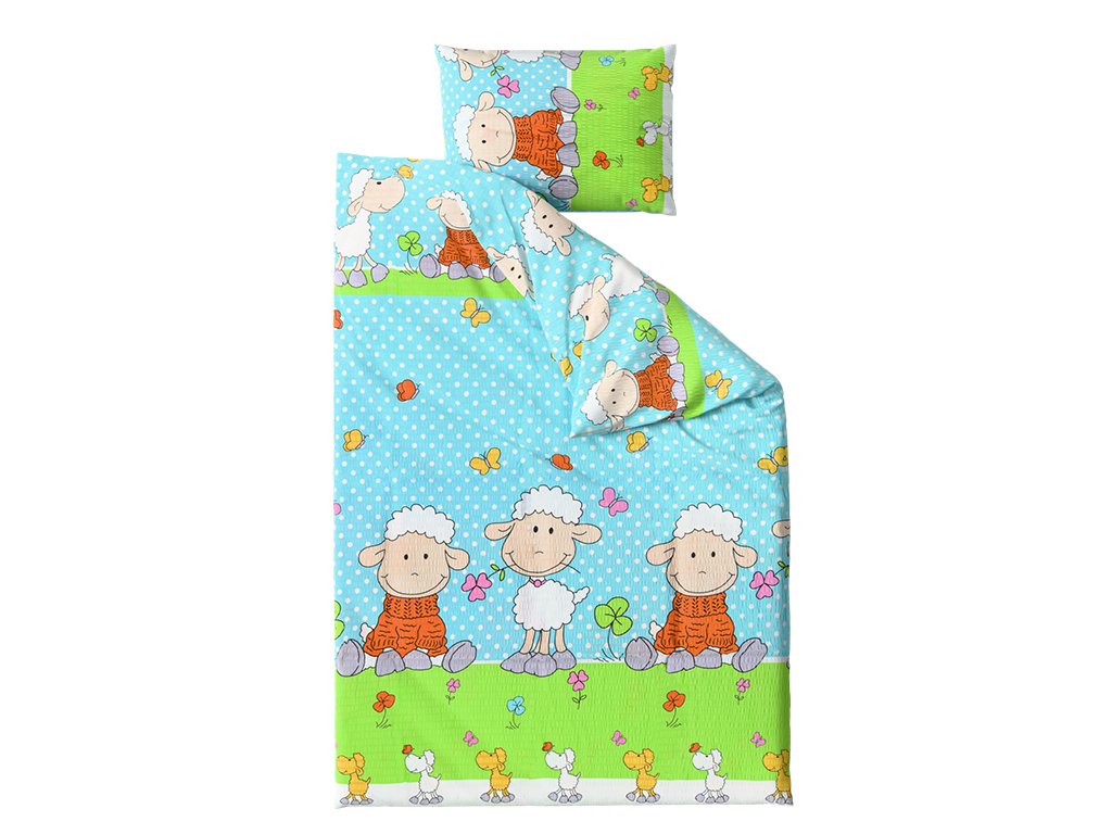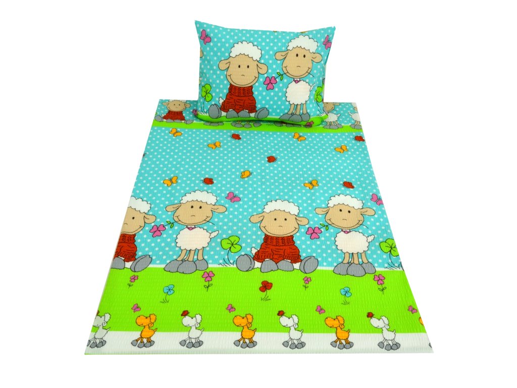 Rozkošné krepové obliečky do postieľky OVEČKY modré prinesú vášmu dieťaťu pohodlie a pokojný spánok. Jemný motív ovečiek na pastelovo modrom podklade so zelenými a farebnými detailmi zaujme každé malé dieťa a zároveň spríjemní vzhľad detskej izby.