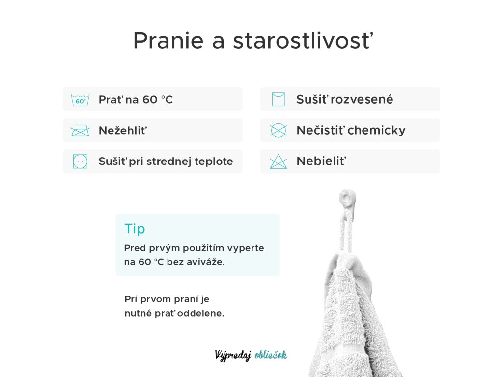 Túžite po stále jemných a mäkkých osuškách?! Najdôležitejšia je správna starostlivosť. Odporúčame osušky pred prvým použitím oprať pri teplote 60 °C, potom vysušiť vo visu alebo v bubnovej sušičke na normálnu, skôr nižšiu teplotu. Osušky sa nesmú čistiť chemicky, ani bieliť. Žehlenie sa neodporúča z dôvodu možného poškodenia slučiek, materiál by stratil savosť a svoju jemnosť.