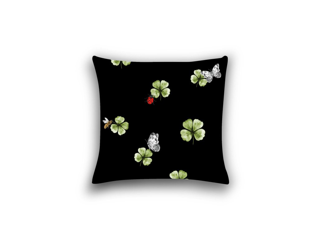 Dekoratívny poťah na vankúš FOUR LEAF CLOVER 40x50 cm očarí jednoduchým, ale výrazným dizajnom. Čierny podklad s motívmi zelených štvorlístkov, lienok, motýľov a včiel dodáva vankúšu prírodný a hravý nádych.