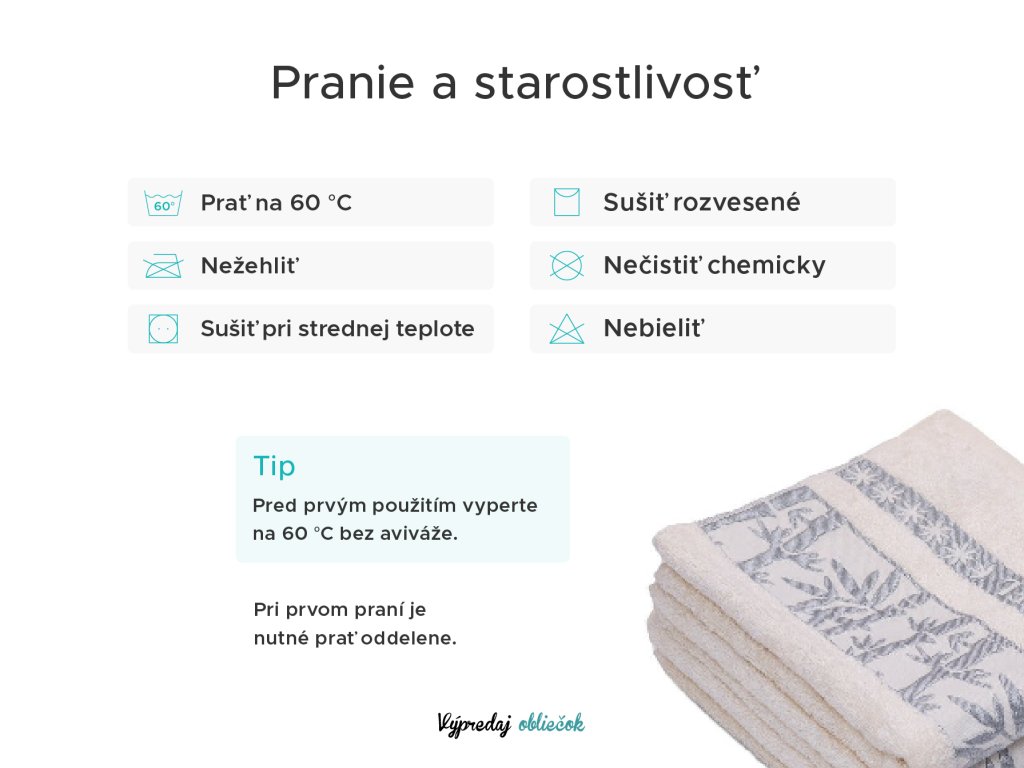 Chcete, aby vaše uteráky boli stále jemné a mäkké?! Dôležitá je správna starostlivosť o daný produkt. Uteráky odporúčame pred prvým použitím vyprať pri teplote 40 °C, potom usušiť zavesené alebo v bubnovej sušičke na normálnej, skôr nižšej teplote. Uteráky sa nemôžu čistiť chemicky, ani bieliť. Žehlenie sa neodporúča z možného poškodenia slučiek, materiál by stratil savosť a svoju jemnosť.