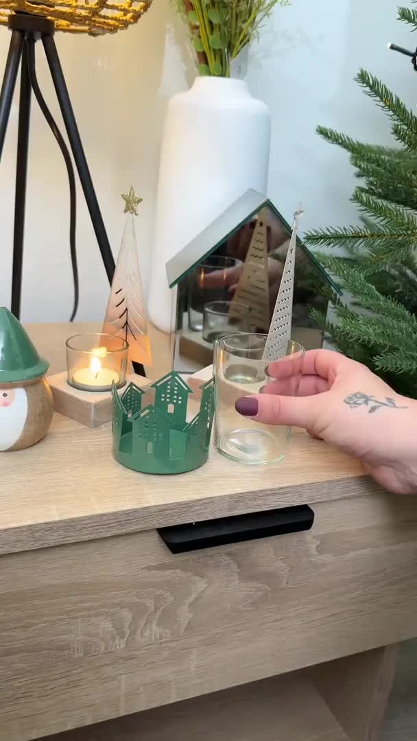 Zelený okrúhly svietnik s motívom domčekov LUMINAIRE