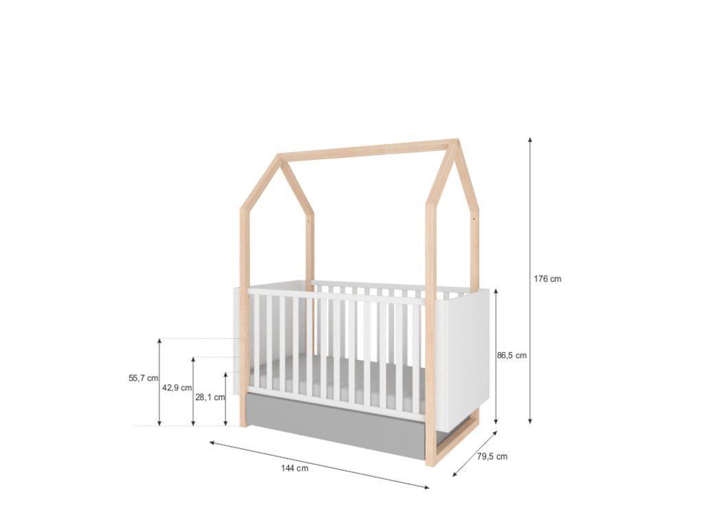 - tri úrovne polohy rámu matraca prispôsobené úrovni vývoja dieťaťa (55,6 / 42,8 / 25,2 cm od podlahy)
