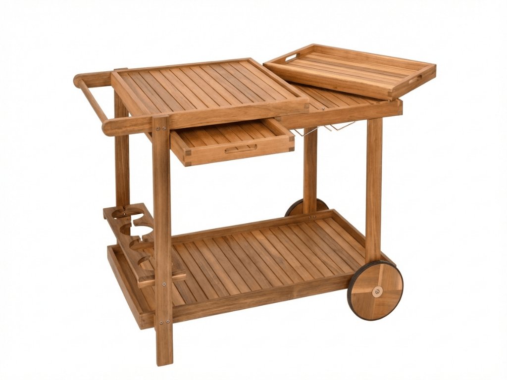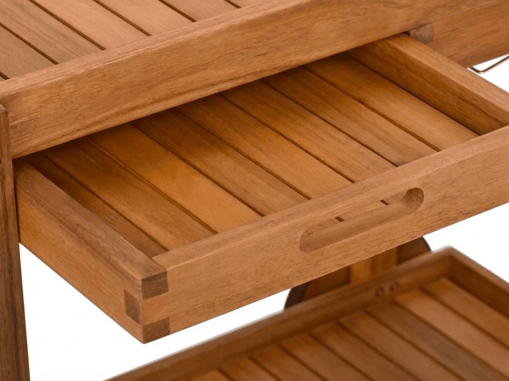 Záhradný servírovací stolík z akáciového dreva je praktickým pomocníkom pre letné posedenie, rodinné oslavy aj neformálne záhradné party. Vďaka dostatku úložného priestoru, odnímateľným tácam a držiakom na fľaše i poháre budete mať všetko potrebné vždy poruke. Odolná konštrukcia s olejovou impregnácou je vhodná pre vonkajšie použitie a prirodzený vzhľad dreva jednoducho zapadne do každej záhrady, na terasu i balkón. Stolík uľahčí servírovanie a prispeje k pohodovej atmosfére pri spoločných chvíľach s priateľmi.